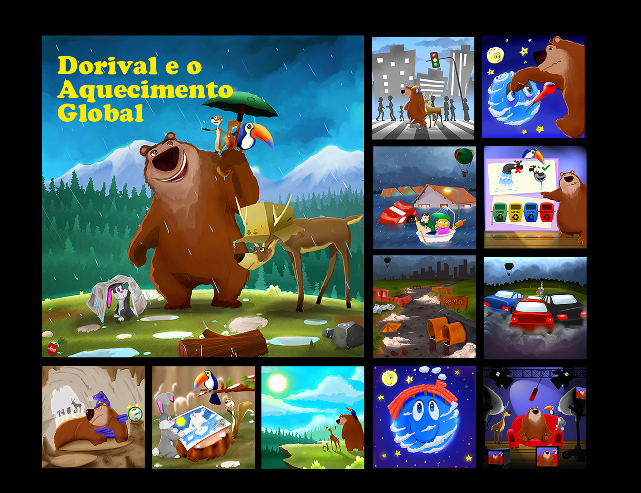 Bellow, another exemple. For this project for the Coca Cola Company, I incorporated the color script technique into my creative process, this way I have a color suggestion at the same time I define each scene in the story. These are just some scenes that I separated for you to understand the process, I create a total of 250 small illustrations/scenes like these below.