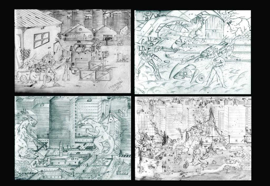 Eu adorava colocar os grandes heróis conhecidos contra meus robôs assassinos…  Diversão pura. Babava o papel todo fazendo barulhos com a boca simulando os tiros… Eu tinha um foco nesta época, inventei que teria que fazer um HQ (História em Quadrinhos) por isso criei vários personagens e cenários pensando num tema específico. Eu não fazia fan art, sempre gostei de criar meus próprios monstros e heróis. Com a idade de 21 anos após o falecimento de minha mãe eu parei de desenhar por um bom tempo, no mercado não havia nada que desse dinheiro para quem estava começando a desenhar. Segui com minha profissão editor de vídeo/animador gráfico/webdesigner/designer, mas tudo sem muita inspiração, apenas para me manter e pagar as contas. Na ilustração somente alguns traços isolados, meus desenhos já não ocupavam mais a folha inteira como antes, foi um período difícil, mas de grande crescimento para mim.  Quando comecei a trabalhar na área de video games, uma vontade de voltar a desenhar e ilustrar voltou com força total! Claro que sei que se eu não tivesse parado de desenhar eu estaria um monstro hoje… Mas a verdade é que todas estas experiências que vivi serviram de aprendizado para mim.